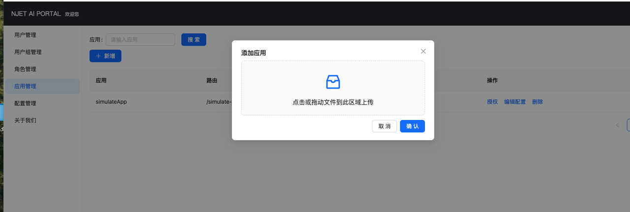 - 在portal 上添加 “Portal版NJet模拟环境应用, 目前发布的模拟应用包为simulate-app_1.0.2.npk,请从NJet的release站点下载