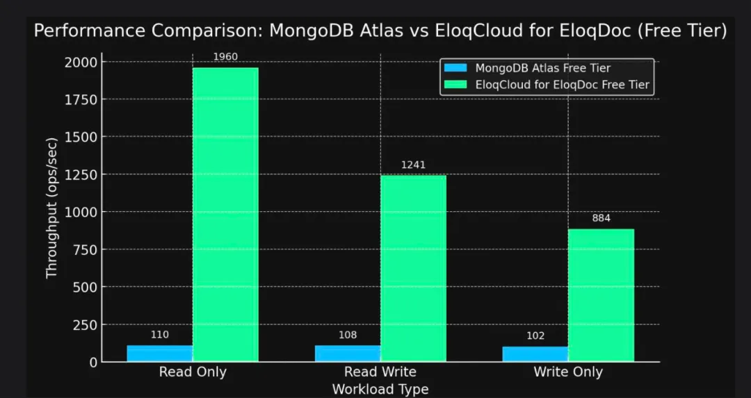 EloqCloud for EloqDoc 持续优于 MongoDB Atlas,性能高出近一个数量级,即使在其Free Tier 环境下也能超出10倍以上吞吐量。