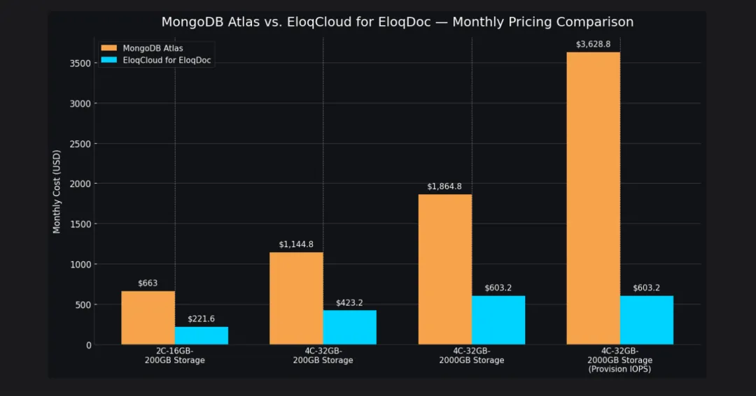 下图展示了在相同配置下,MongoDB Atlas 和 EloqCloud for EloqDoc 的价格对比。