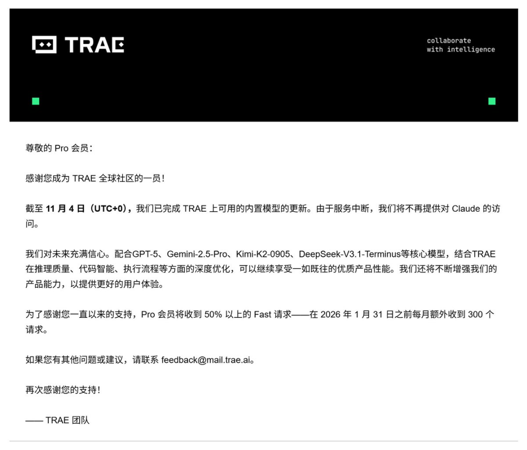 Trae 表示向 Pro 会员提供补偿:自即日起至 2026 年 1 月 31 日,Pro 会员每月将获得 50% 的额外快速请求——每月 300 次。