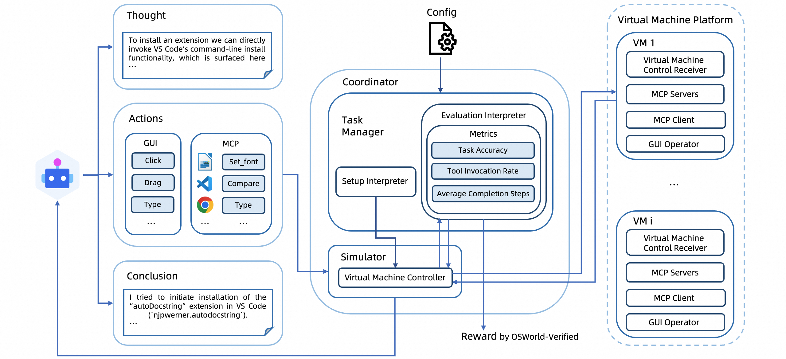 下图是 OSWorld-MCP 评估框架,集成了 GUI 操作和 MCP 工具调用: