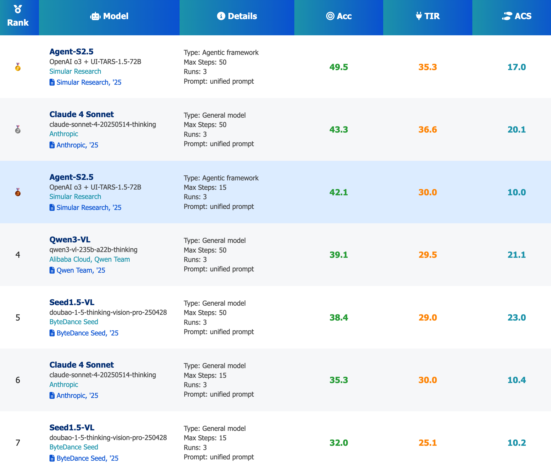 - 观察到的最高工具调用率 ( TIR ) = 36.3%(Claude-4-Sonnet,50 步)→ 表明仍有很大的改进空间