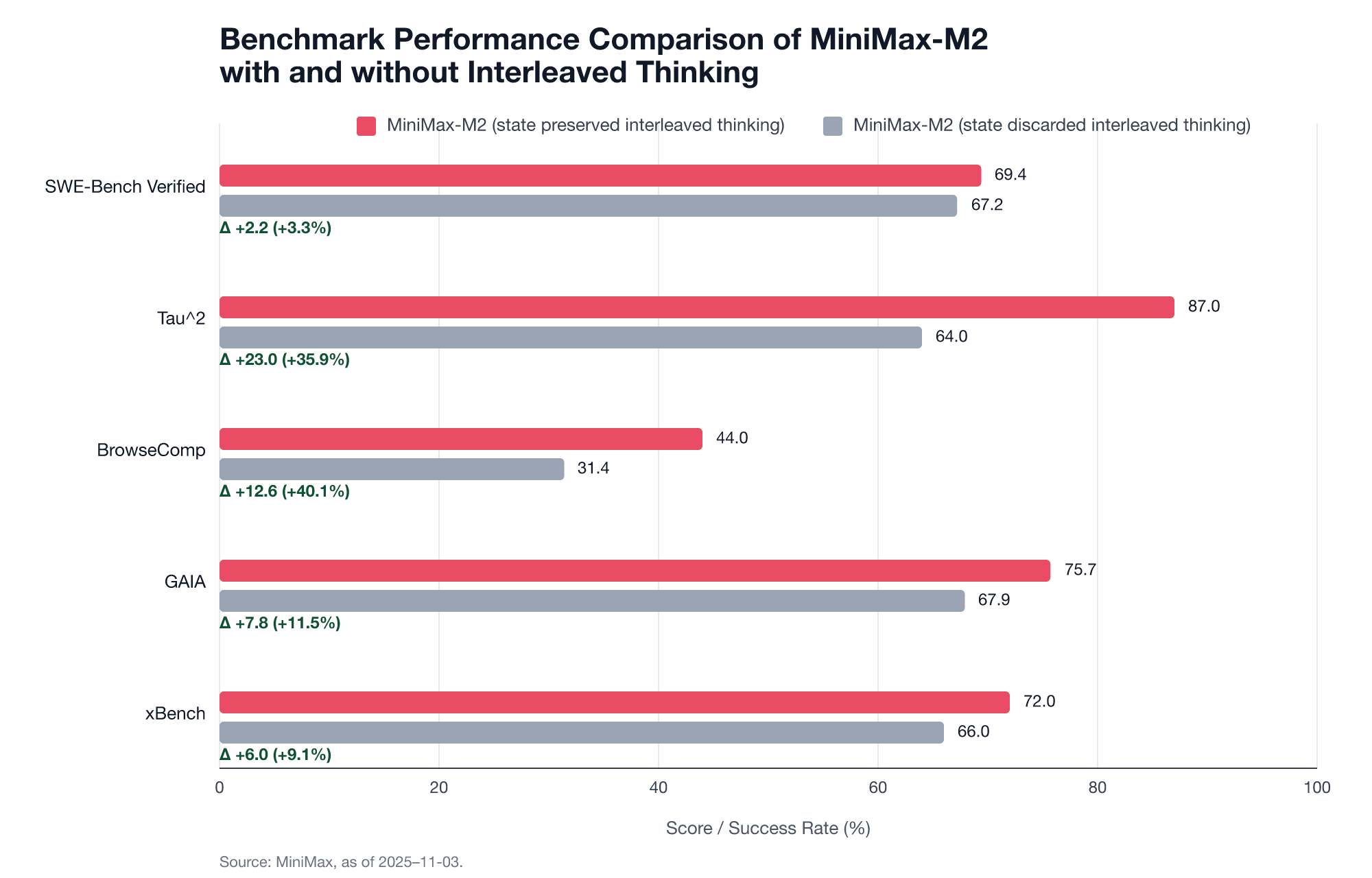 在 MiniMax M2 中,只有保留并把上一轮的推理反馈到后续轮次,Interleaved CoT 才能发挥最大效果。模型会在工具调用之间进行推理,将计划、假设、约束与中间结论持续向后传递—— 正是这种可持续、可累积的推理状态让 M2 模型稳定可靠。一旦丢弃了之前的推理状态,模型的累积理解能力会下降,状态偏离会增加,自我修正能力会减弱,规划能力也会退化,尤其在长程(long-horizon)工具调用和 “运行–修复” 循环中更为明显。