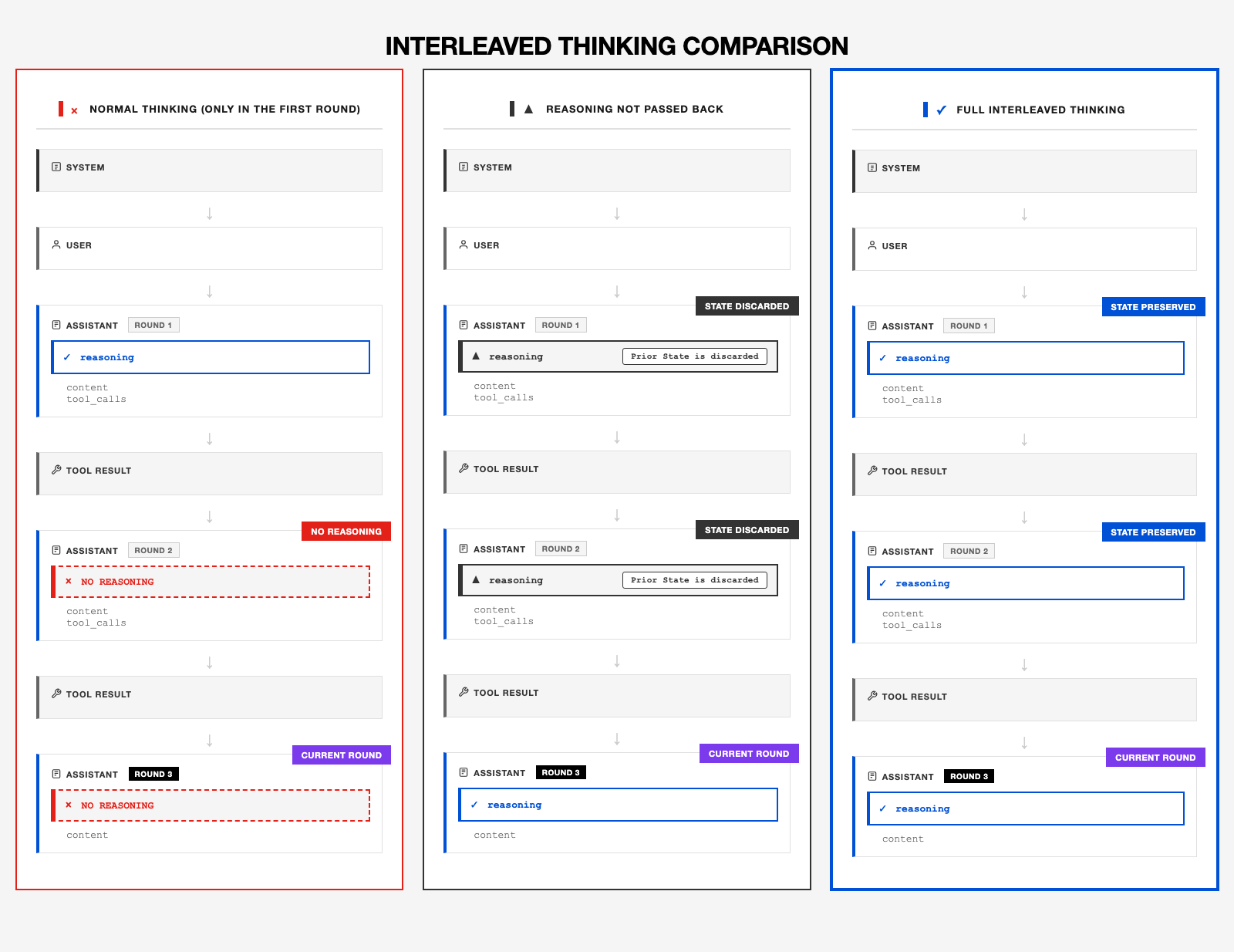 Interleaved Thinking 对 Agent 至关重要:它指在显式推理(reasoning)与工具调用(tool use)之间交替进行,并把推理结果持续带入后续步骤。这一过程能显著提升在长程任务中的规划能力、自我修正能力与可靠性。