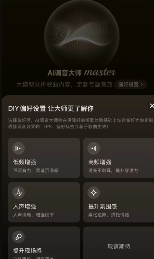 此外,个性化定制也是这一功能的一大亮点。用户可以在偏好设置中进行进一步调节,比如选择 “低频增强” 或者 “提升现场感” 等选项。AI 调音大师将会在确保整体听歌体验的基础上,叠加用户的个性化偏好,让每一首歌都能够更加贴合用户的需求。