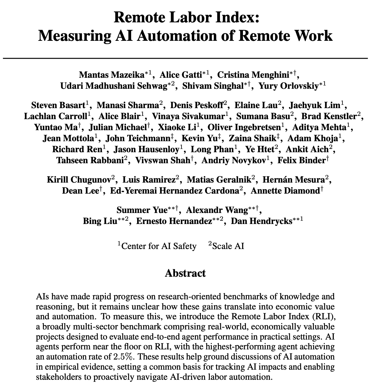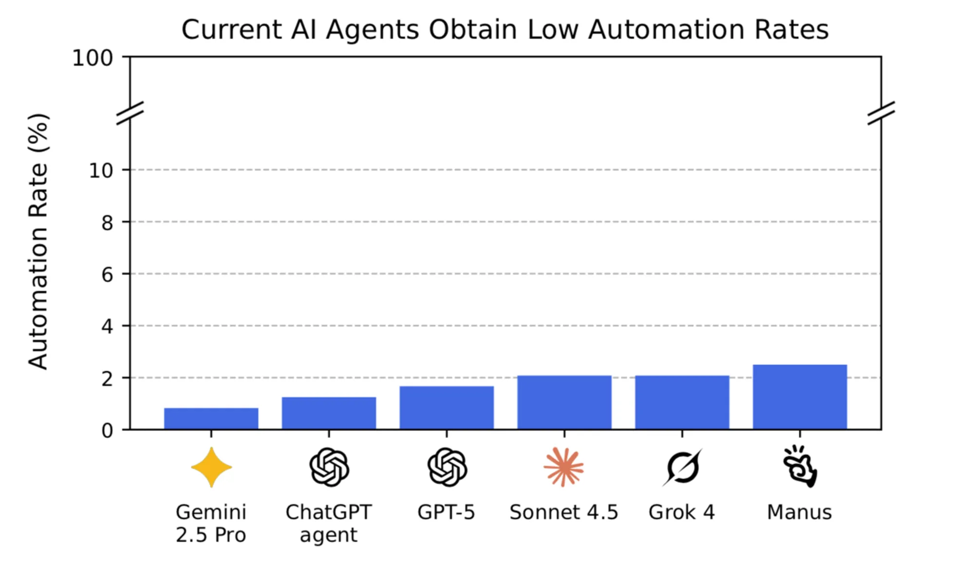 最新基准研究显示,即便是当前最先进的 AI 智能体(AI Agents),在真实世界的自由职业任务中表现依旧乏力,成功率不足 3%。