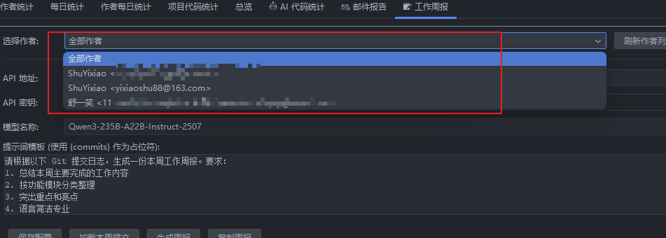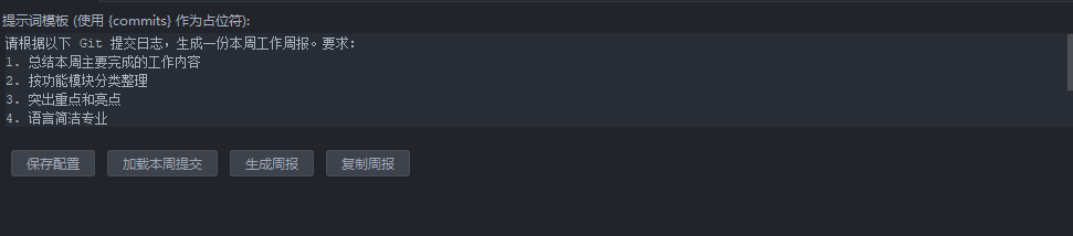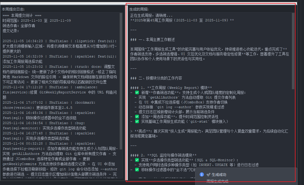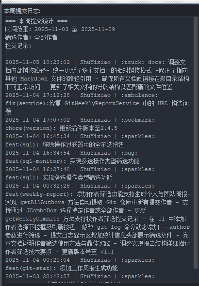 📁 架构分层 ├── 🎯 服务层 (GitWeeklyReportService) │ ├── Git日志自动提取 │ ├── 作者智能筛选 │ └── AI流式调用 ├── 💾 配置层 (WeeklyReportConfigState) │ ├── 项目级配置持久化 │ └── 支持多项目独立配置 └── 🖥️ 界面层 (GitStatToolWindow) ├── 直观的配置面板 └── 实时的流式展示