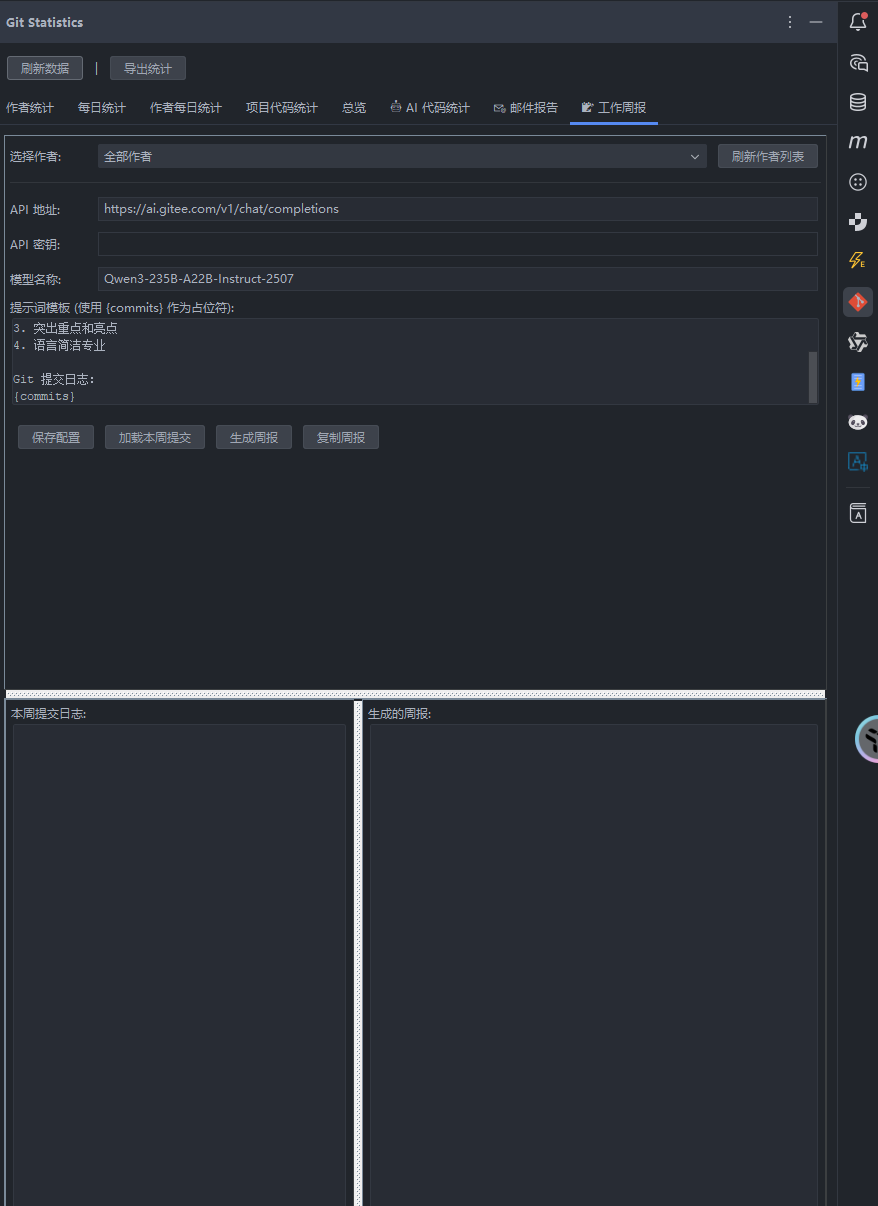 右侧工具栏 → Git Statistics → 📝 工作周报