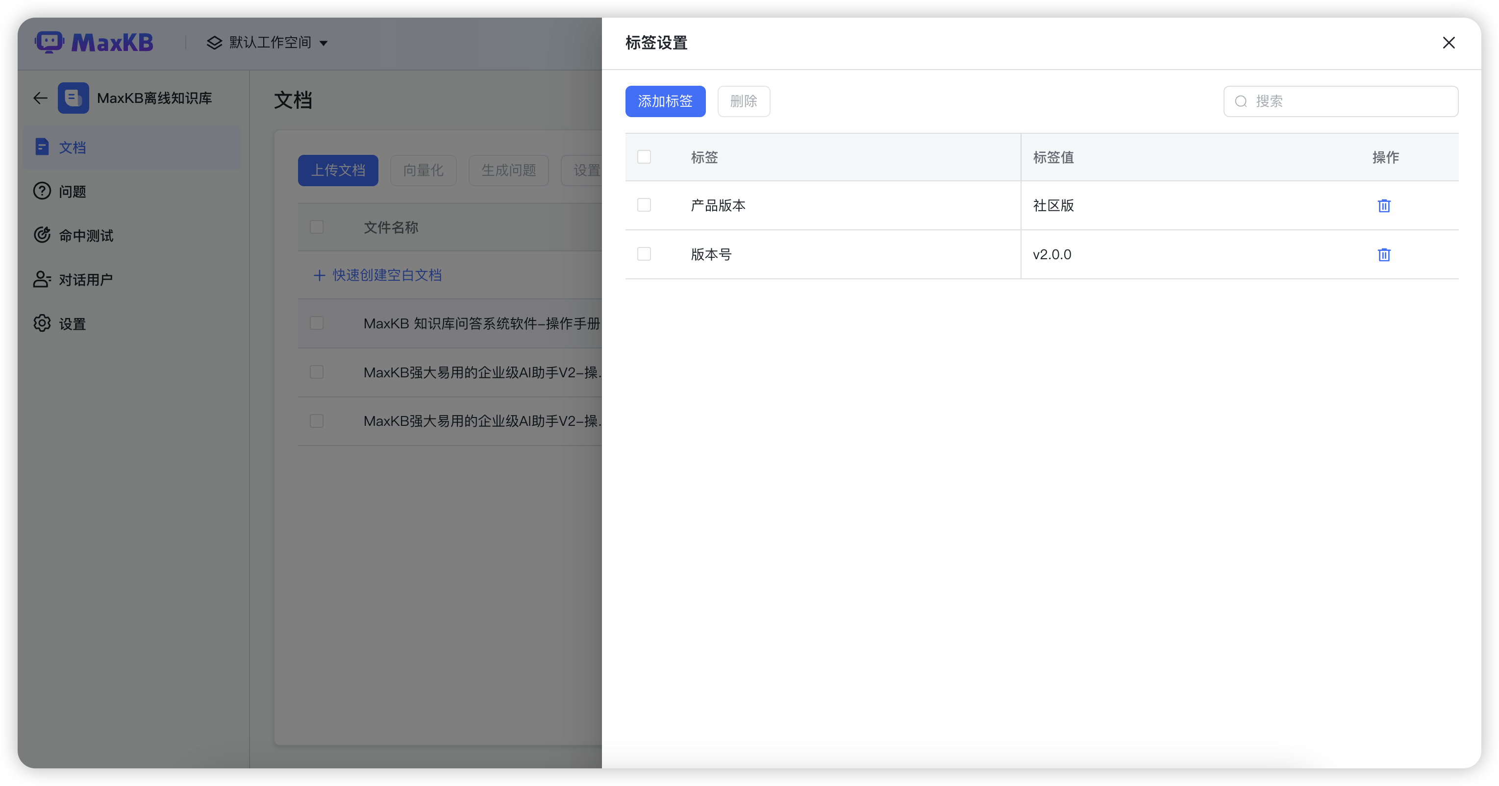 标签设置:MaxKB在知识库的文档列表中新增了标签设置功能,用户可以打开“标签设置”页面为每个文档添加标签。