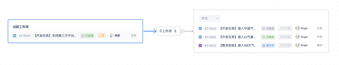 工作项详情右上角点击「研发数据拓扑」按钮即可打开。拓扑图支持节点展开、状态变更、缩略视图、全屏查看等操作,适配社区版、企业版与专业版。