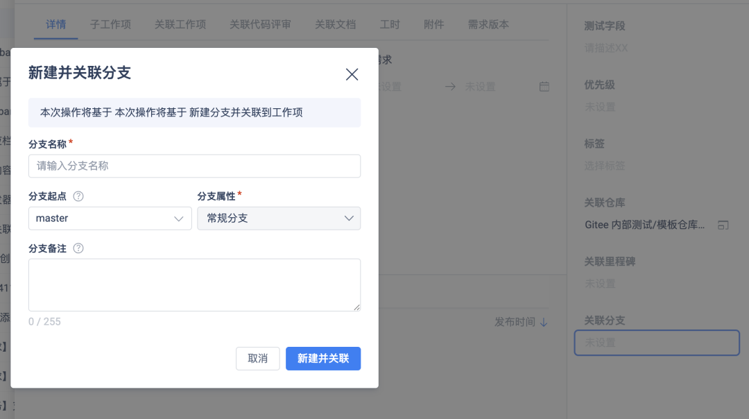 工作项在关联代码分支时,现已支持直接新建并关联分支,无需手动跳转至代码仓库进行创建。新建弹窗将自动加载当前工作项已关联仓库信息,并根据用户权限智能判断操作范围,进一步打通任务与开发的联动链路。