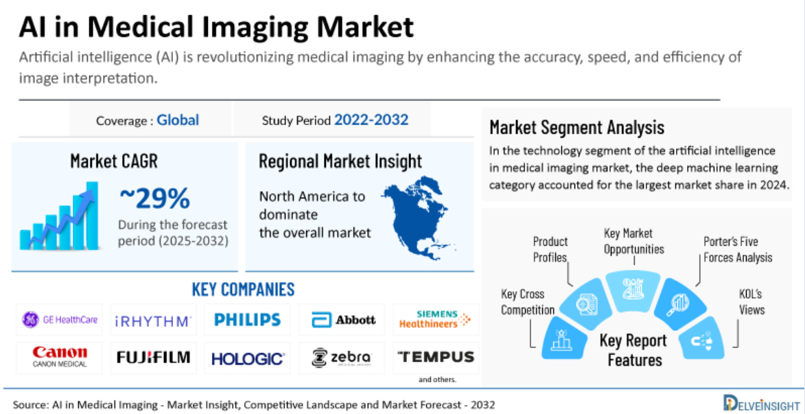 研究机构 DelveInsight 最新报告指出,全球AI医疗影像市场规模预计将从2024年的16亿美元飙升至2032年的约130亿美元,年复合增长率约29%。这一增长势头得益于技术突破、政府支持与资本加码。