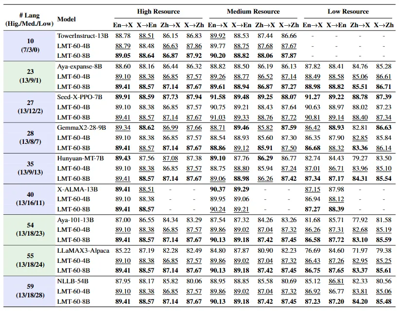 在 FLORES-200 基准上,LMT 在同等语言覆盖规模的模型中取得了SOTA性能,实现了较广泛的语言覆盖度和全面的翻译能力。