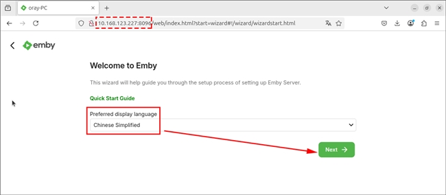 执行命令后等待几秒,打开浏览器访问localhost:8096,即可进入Emby的初始化页面。
