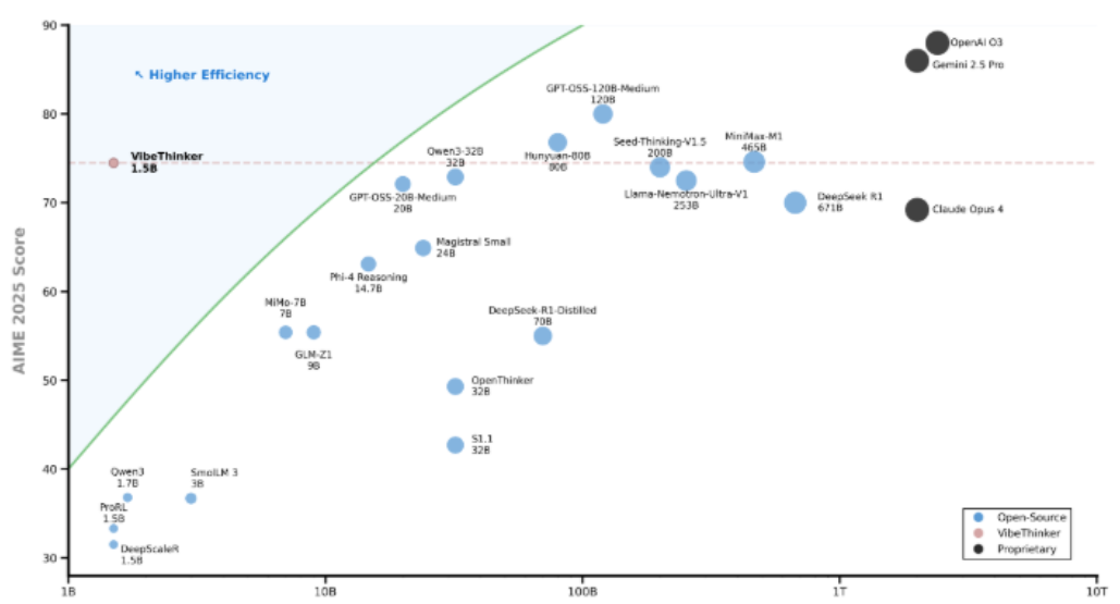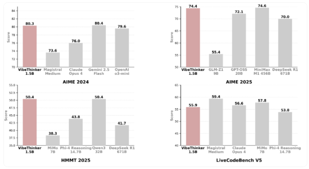 尽管 VibeThinker-1.5B 体积小,但在数学和代码任务上表现出色,达到了行业领先的推理性能,甚至超越了体量达6710亿参数的竞争对手 DeepSeek 的 R1模型。该模型还与 Mistral AI 的 Magistral Medium、Anthropic 的 Claude Opus4和 OpenAI 的 gpt-oss-20B Medium 等多个大型模型抗衡,同时所需的基础设施和投资成本却少得多。