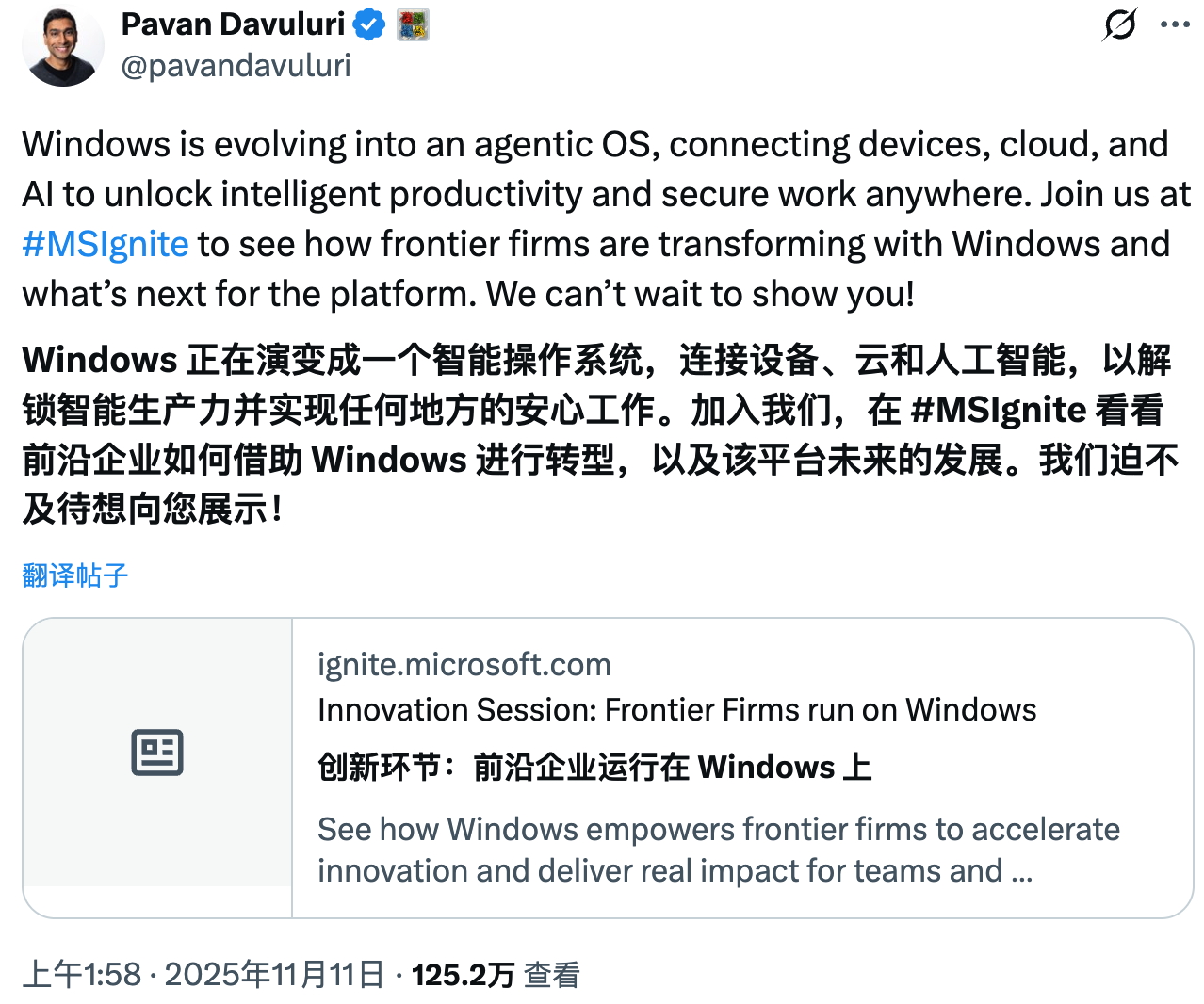 几天前,Davuluri 在 X(原Twitter)官方账号上公开表达了对于即将召开的 Ignite 大会的期待,他表示将展示代理型操作系统的最新动态。Davuluri发文称:“Windows 正在进化为代理型操作系统,连接设备、云与 AI,释放智能生产力并保障安随地工作。”