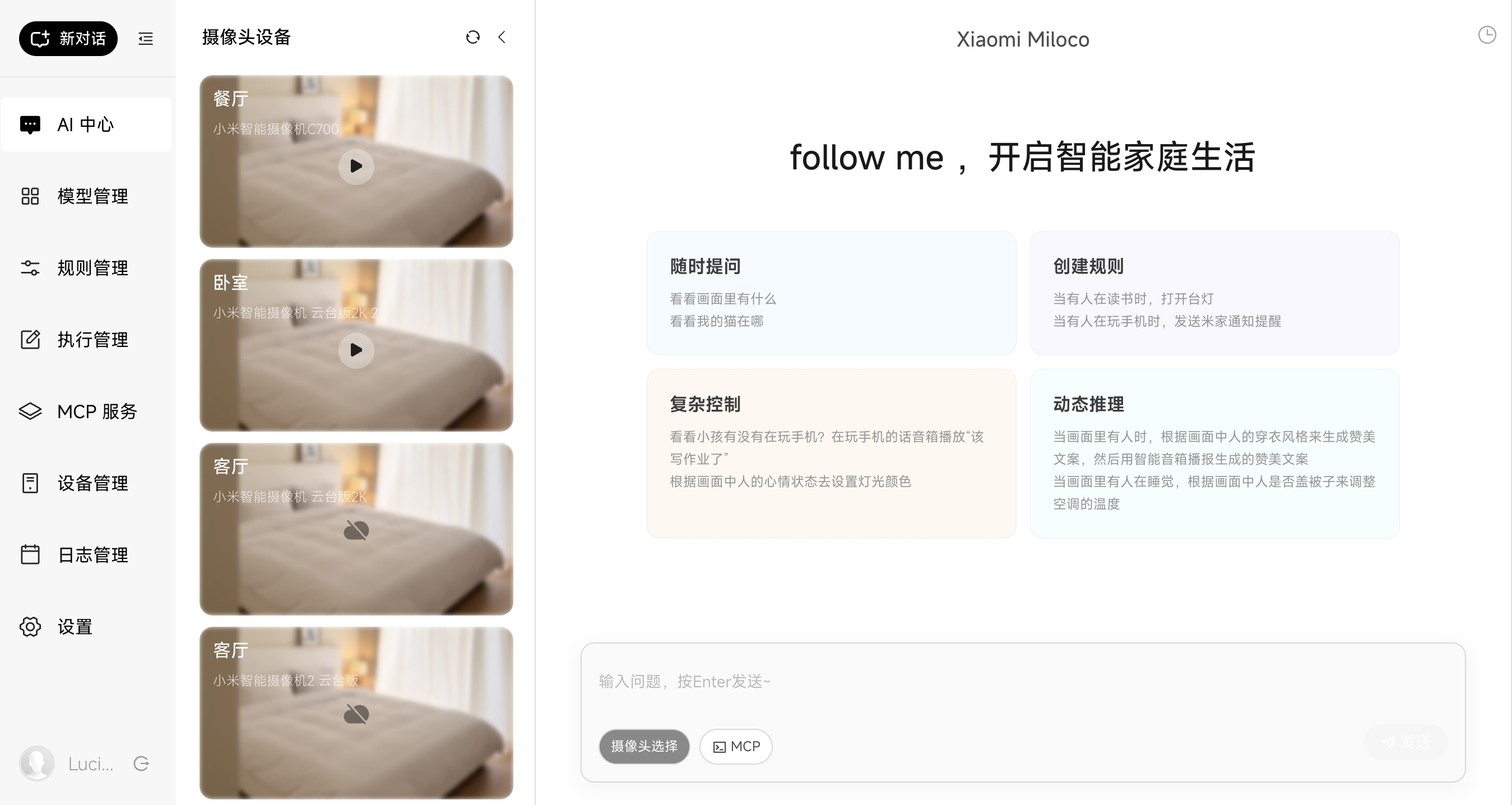 该方案以米家摄像机为视觉信息来源,以自研大模型为核心,打通全屋 loT 设备。基于大模型的开发范式,让用户能够以自然语言定义家庭的各种需求和规则,实现更广泛、更具创意的智能联动。