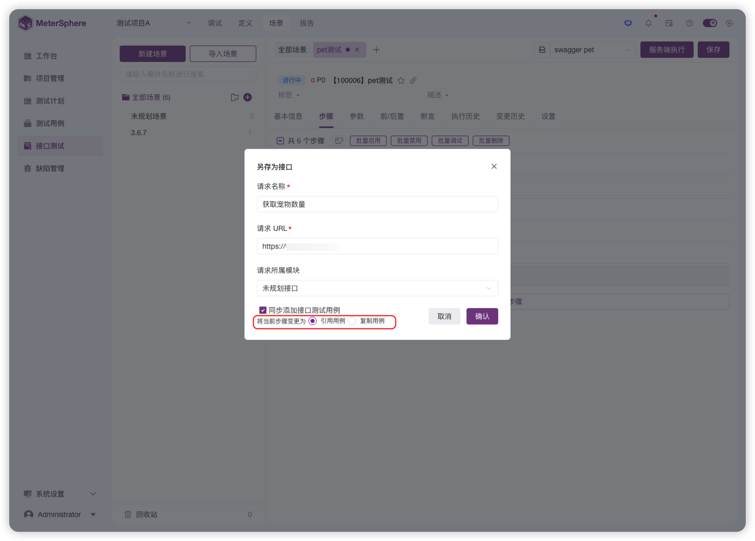 在MeterSphere v3.6.7 LTS版本中,在对接口场景中的自定义请求步骤进行“另存为新接口”的操作时,用户可以一键将当前步骤变更为“引用用例”或“复制用例”步骤。这一功能可以助力测试团队提高接口场景的编写效率,并且可以降低测试用例的维护成本。