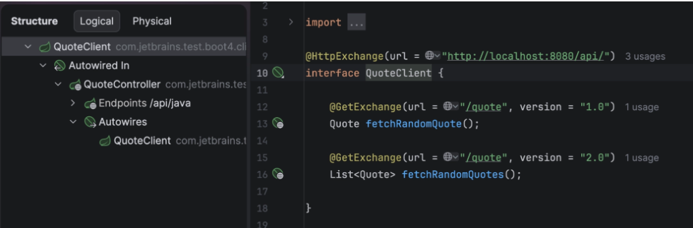 目前,要支持 HTTP Interface client 的版本控制,仍然需要手动编写配置。IntelliJ IDEA 2025.3 将 HTTP 接口识别为 bean —— 不再出现“红色波浪线”或“无法解析 bean”的警告。无论在何处使用这些客户端,都将获得完整的自动补全、导航和注入支持。