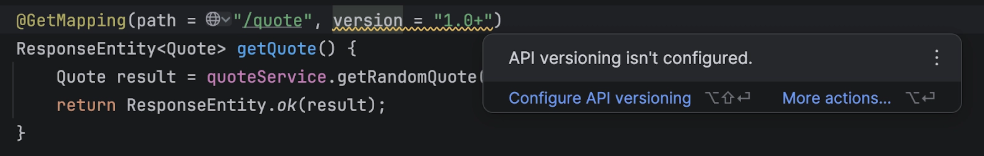 IntelliJ IDEA 会自动检测版本控制。IDE 会检查你的应用是否配置了版本控制,识别你使用的是属性还是ApiVersionConfigurer类,如果出现问题还会发出警告。如果你忘记启用版本控制,IDE 不仅会指出问题所在,还会告诉你如何修复。
