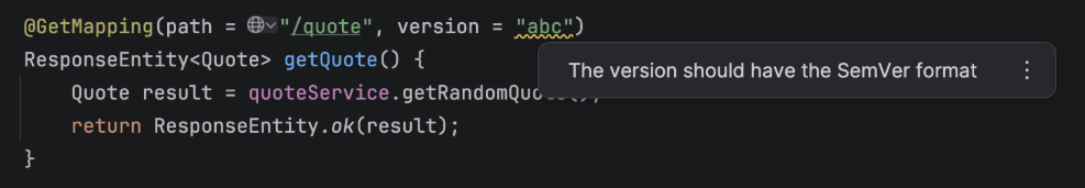 可以在@GetMapping注解中的版本号上按住 Ctrl 键点击,直接跳转至配置代码。IDE 还会检查你的版本值是否遵循标准的 SemVer 规则。