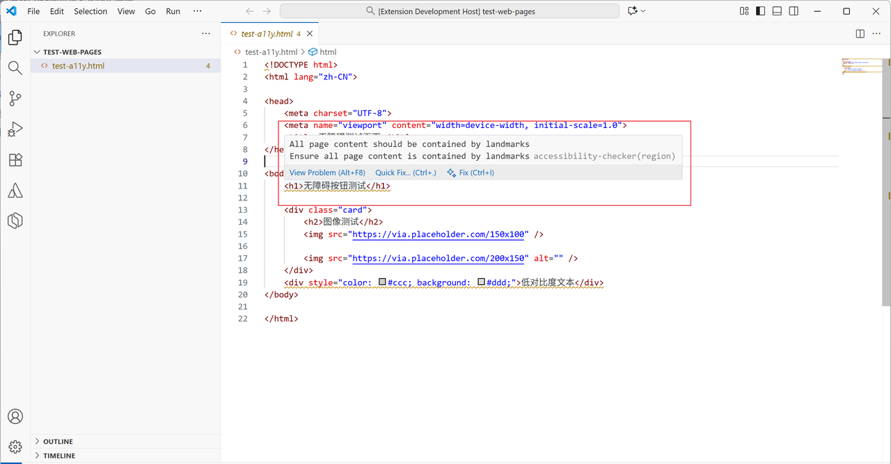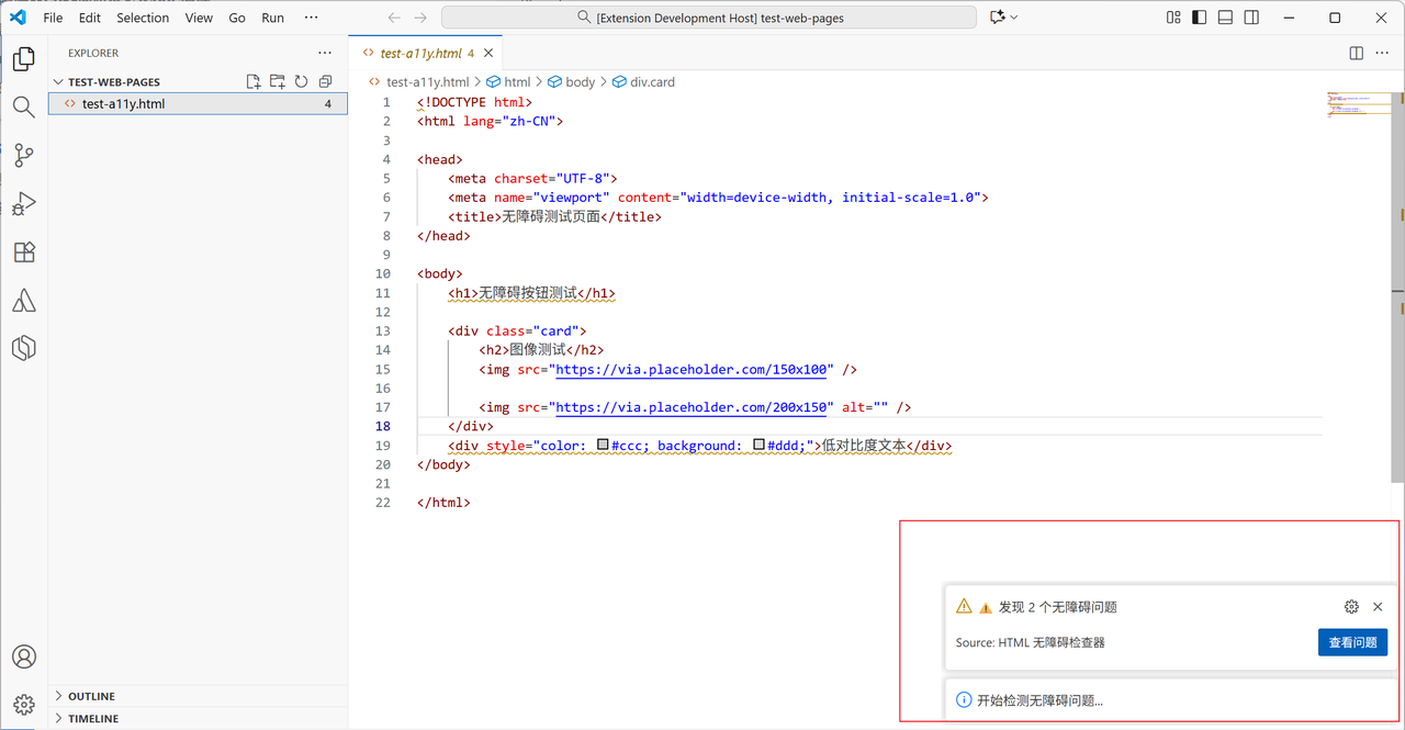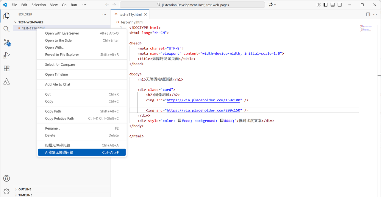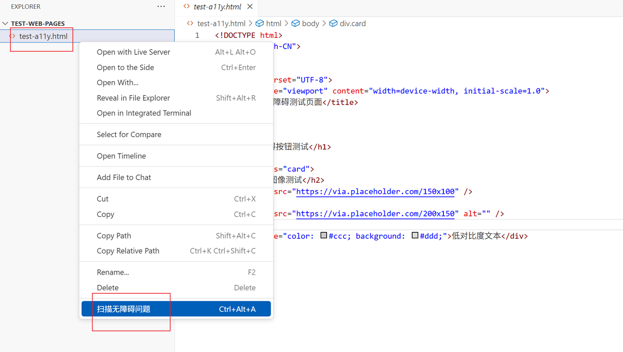安装该扩展,打开html文件,在右键菜单中找到无障碍检测