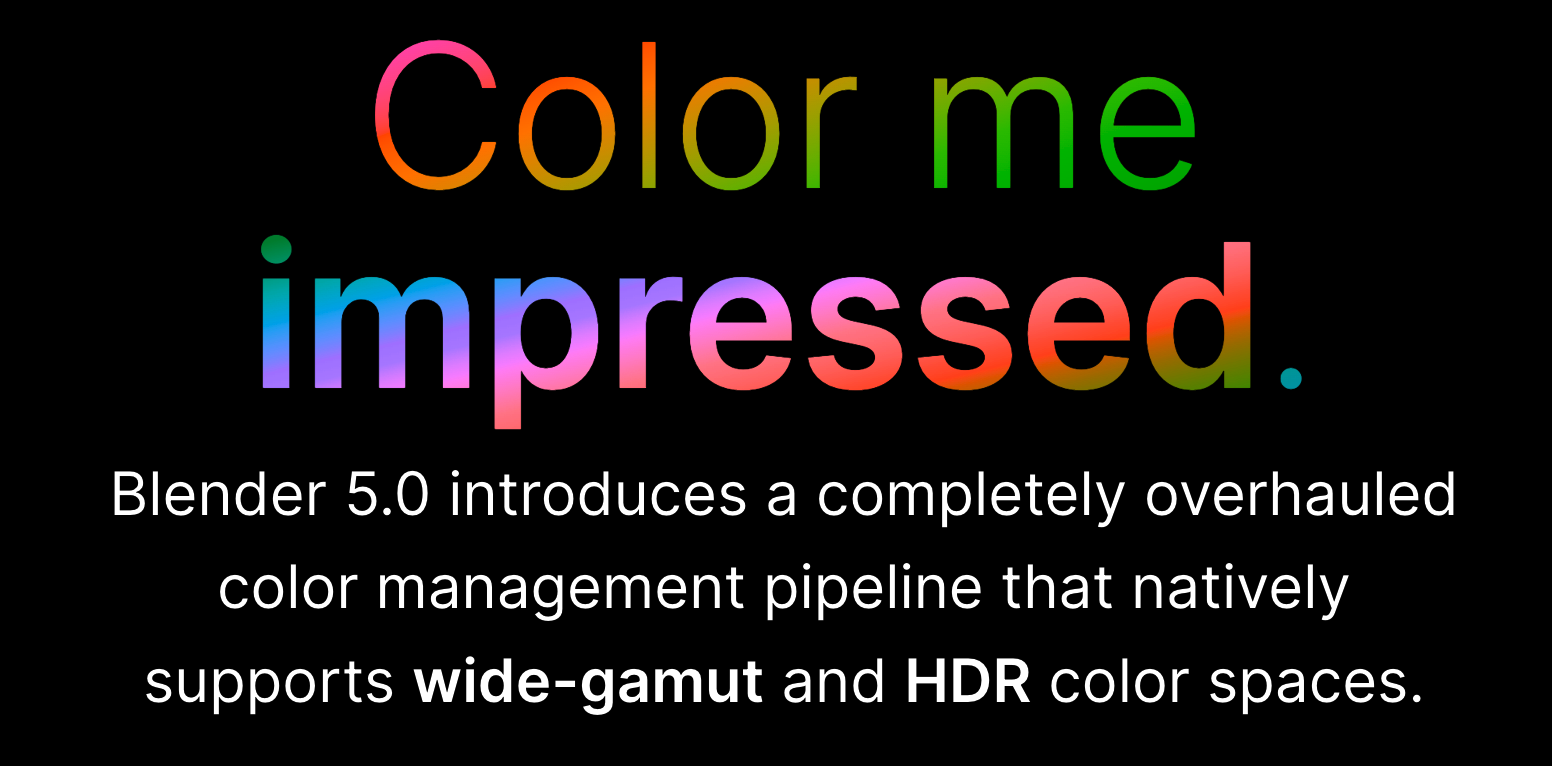 Blender 5.0 引入了一套完全重新设计的色彩管理流程,原生支持广色域和 HDR 色彩空间。