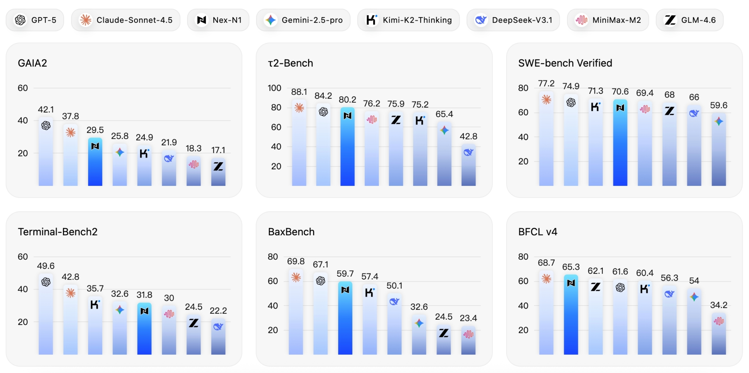 - 全链路开源:可一键获取的数据合成管线、高质量训练数据集、全尺寸能动性模型 Nex-N1、Agent 开发框架 NexAU、MoE 推理服务框架 EaaS、强化学习训练服务框架 NexRL,开源生态完备。