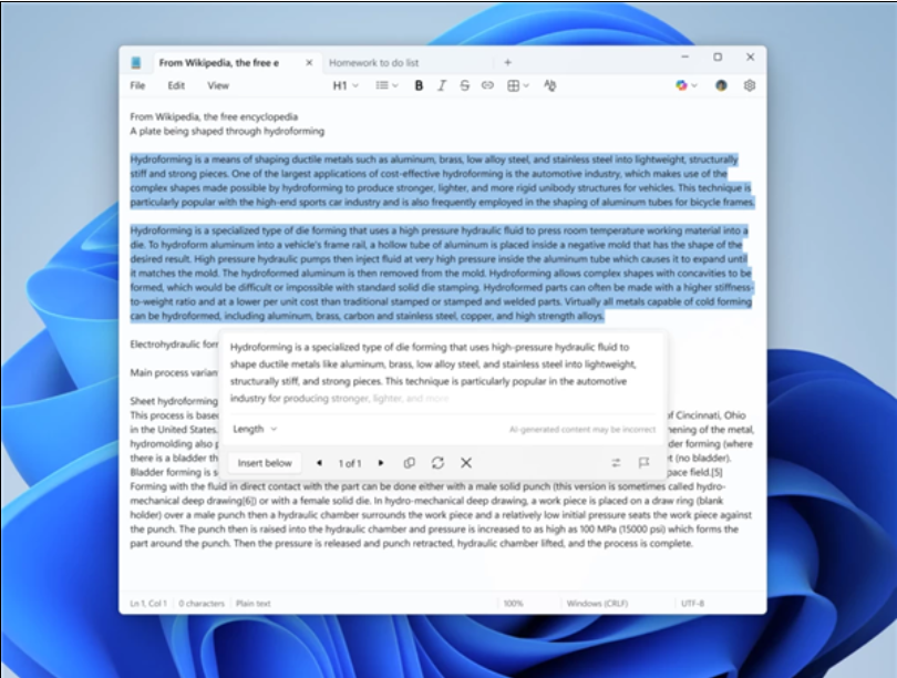 表格插入后,用户可以通过右键上下文菜单或工具栏中的“表格”菜单,进行快速编辑,例如添加或删除行和列。除了表格功能外,最新的记事本更新还改进了其内置的AI功能体验,以加快“生成”、“重写”和“摘要”等功能的速度。