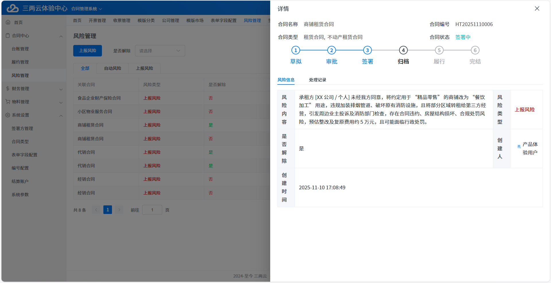 系统构建从起草、审批、签署到履约、归档的全流程 “风险防火墙” 。支持风险事件的上报、跟踪与解除,实现风险“事前预警、事中可控、事后可溯”的闭环管理,降低企业合规风险。