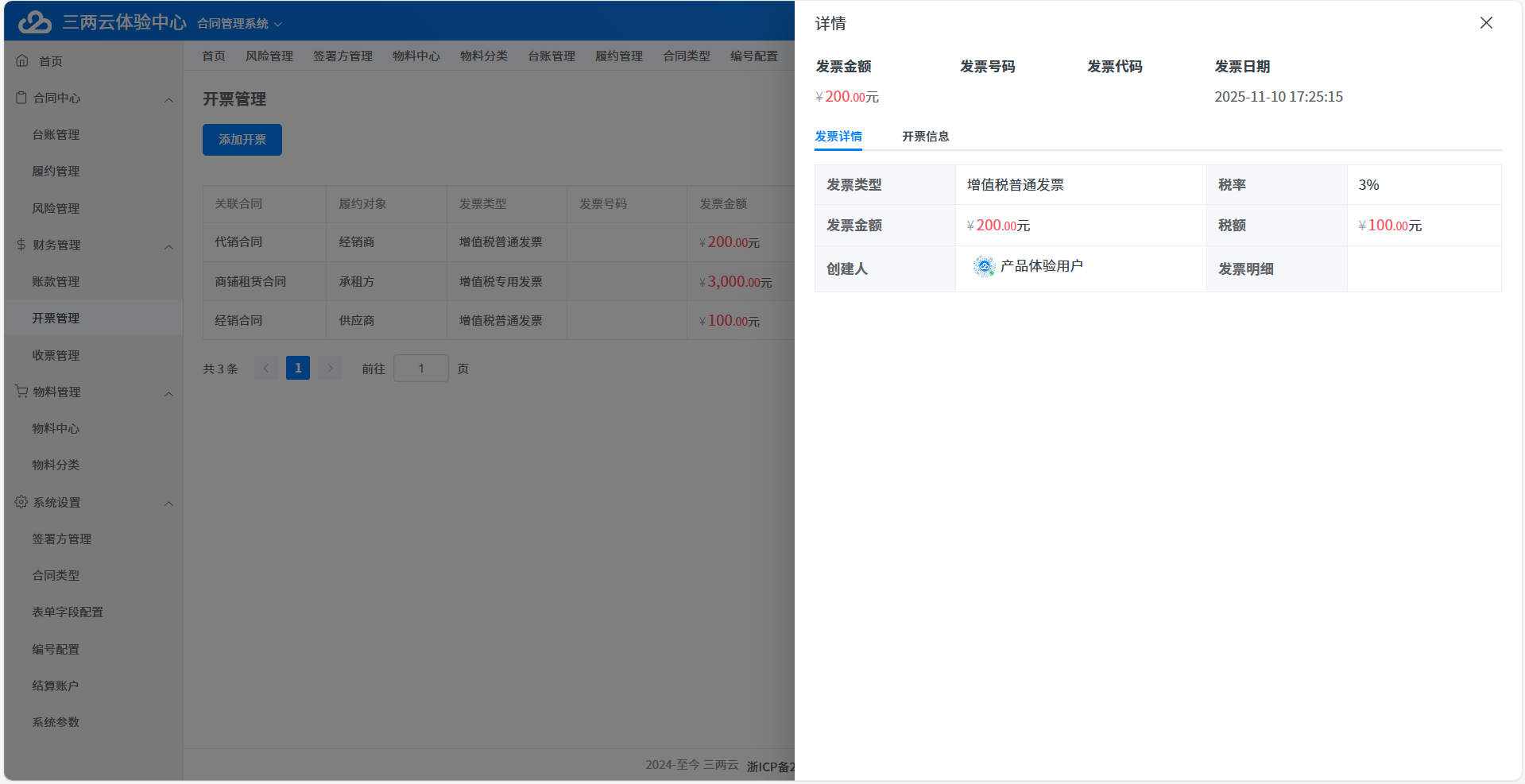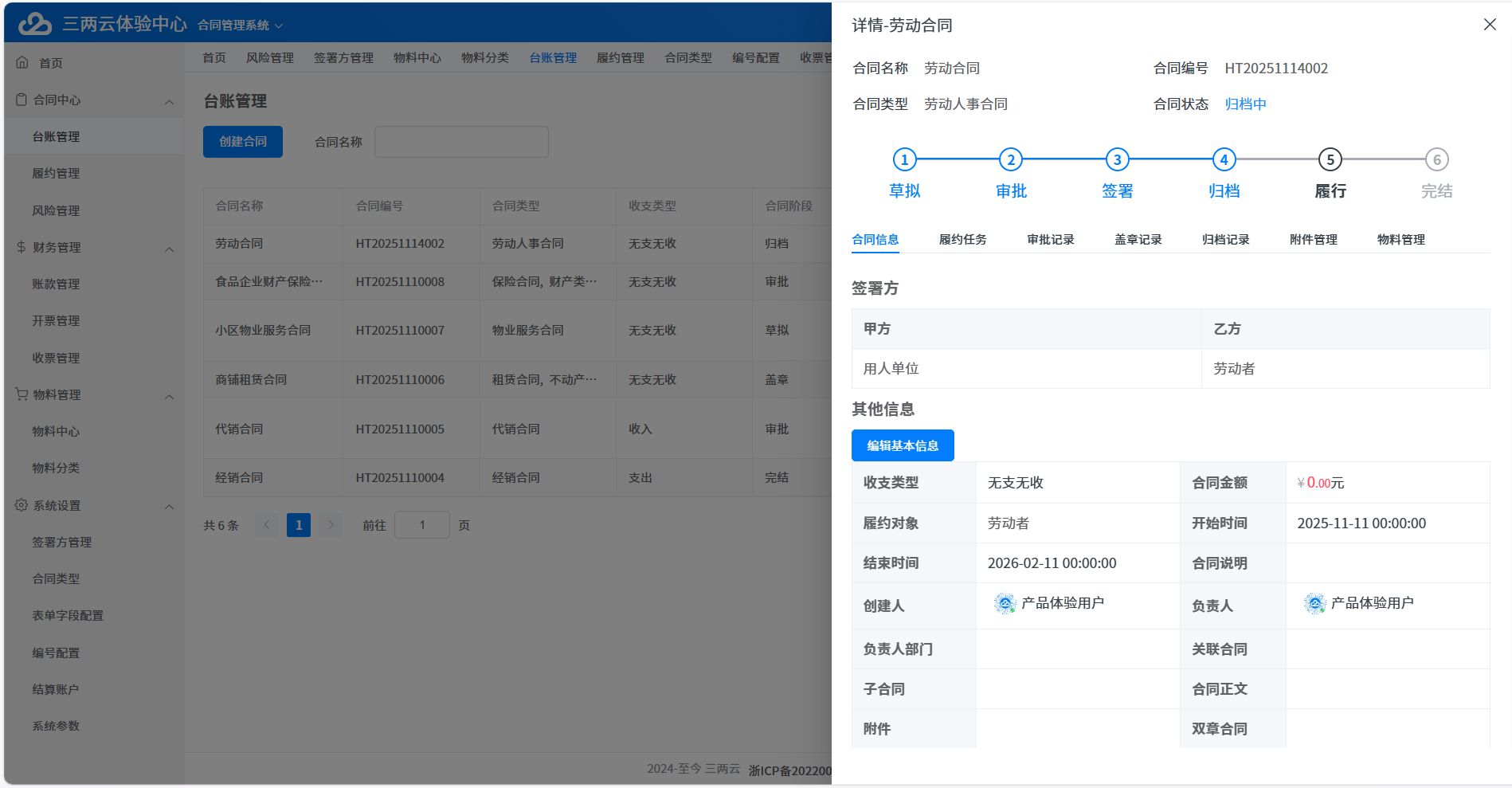 合同起草与模板管理:创建合同页面,涵盖合同名称、类型、模板、签署方、收支类型等字段的录入/选择功能,帮助企业标准化录入合同信息,为合同全生命周期管理提供数据支撑。还可自定义合同调用模板,快速生成合同。