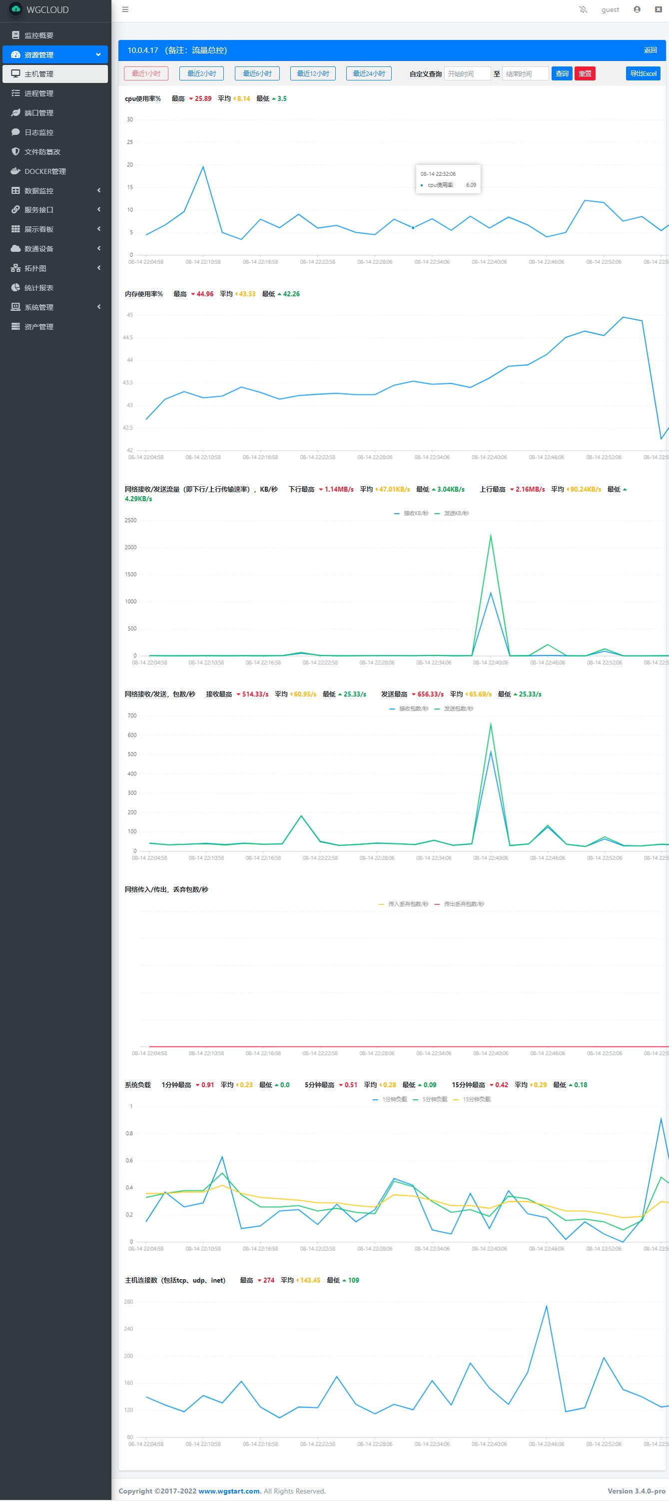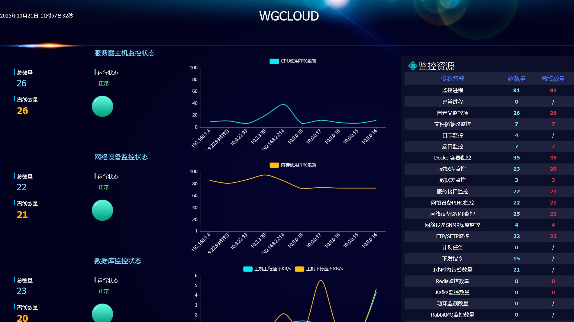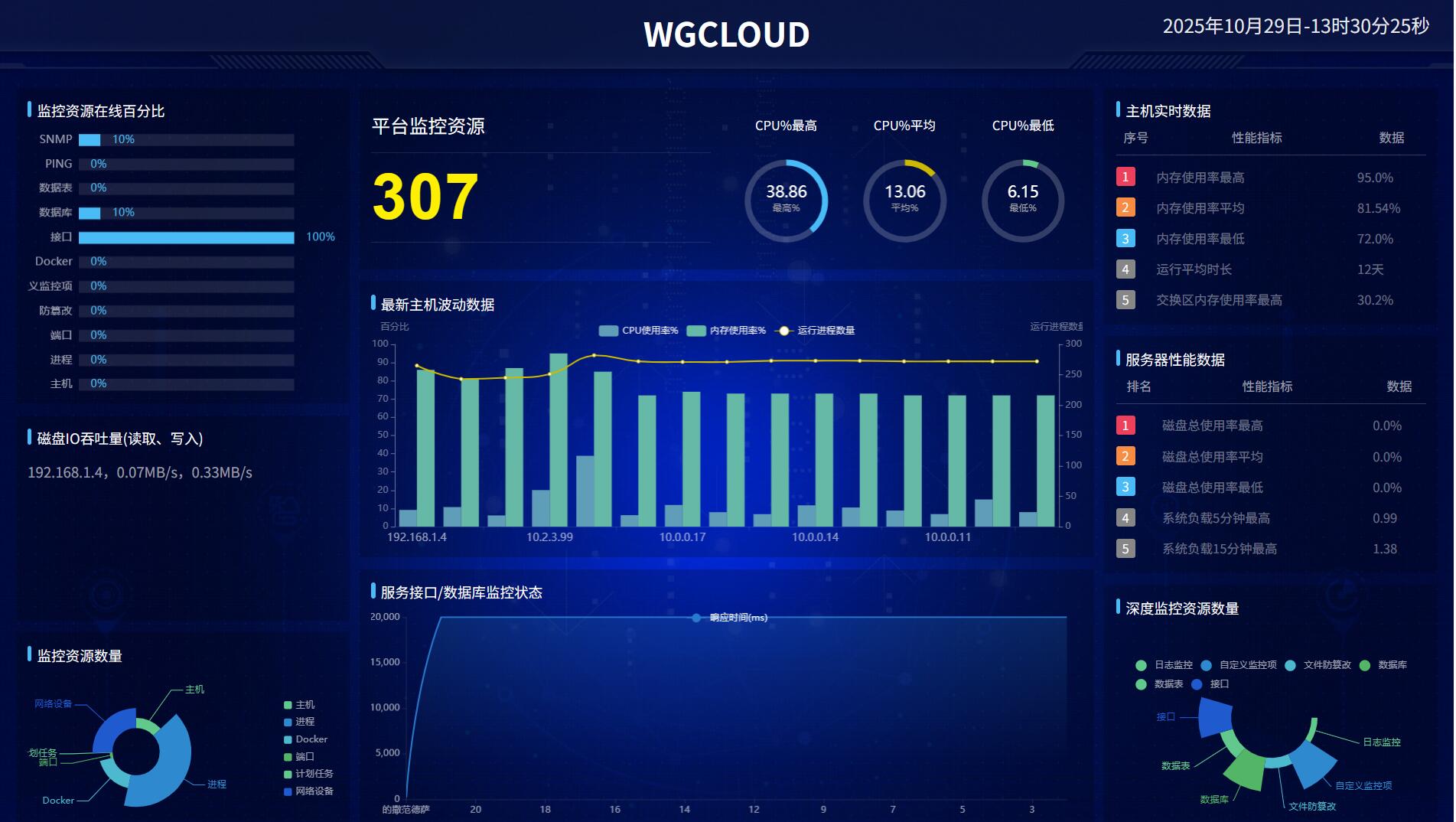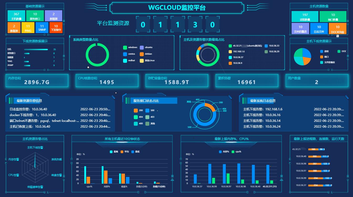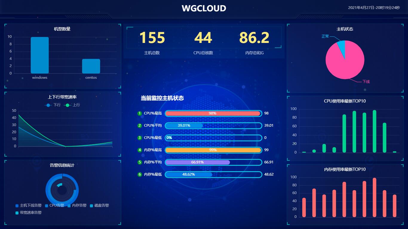 WGCLOUD 是一款集成度较高的分布式运维监控平台,具有集群监控,易部署、易上手使用、轻量、高效、自动化等特点,server 端基于 springboot 开发,agent 端使用 go 编写。核心模块包括:主机系统信息监控,CPU 监控,CPU 温度监控,内存监控,网络流量监控,磁盘 IO 监控,磁盘空间监测,系统负载监控,硬盘 smart 健康检测,应用进程监控,端口监控,docker 监控,日志文件监控,文件防篡改保护,数据可视化监控,自动生成拓扑图、大屏可视化,数通设备监测,服务接口监测,K8S 监测,设备账号管理,web ssh ,指令下发,告警信息(邮件、钉钉、微信等)推送