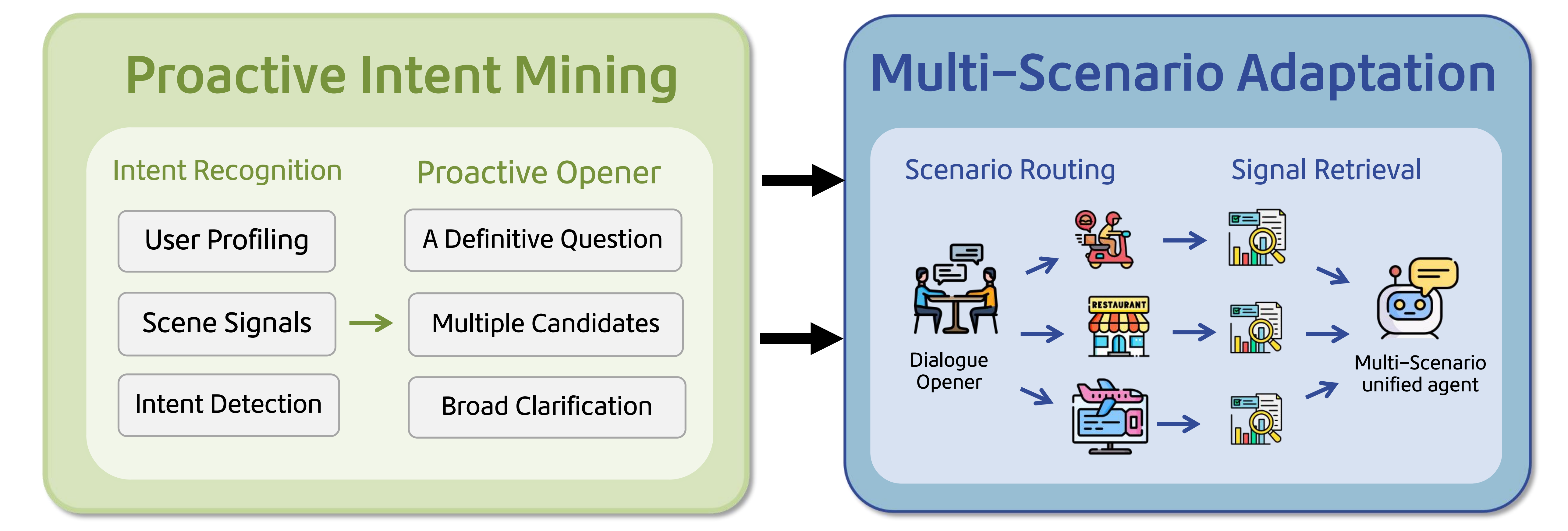 此外,系统融合了"Handoff"模式,允许在必要时将任务及上下文一键转交给其他智能体,实现高可靠性和透明性。主智能体根据实时信号和对话语境灵活采纳子智能体输出,确保关键信号只在合适时机被采纳与执行,有效提升了系统的交互自然性和服务质量。以主动协作 Agent 为例,其智能交互系统能够通过主动意图挖掘与多场景适配,智能识别和确认用户需求,实现自动化场景切换,从而显著提升对话效率和整体用户体验。总体来看,多 Agent 协同机制通过主-子智能体的分工、动态调用与信息整合,构建了高效、灵活且可扩展的智能交互服务体系,为复杂业务场景下的智能服务落地提供了坚实支撑。