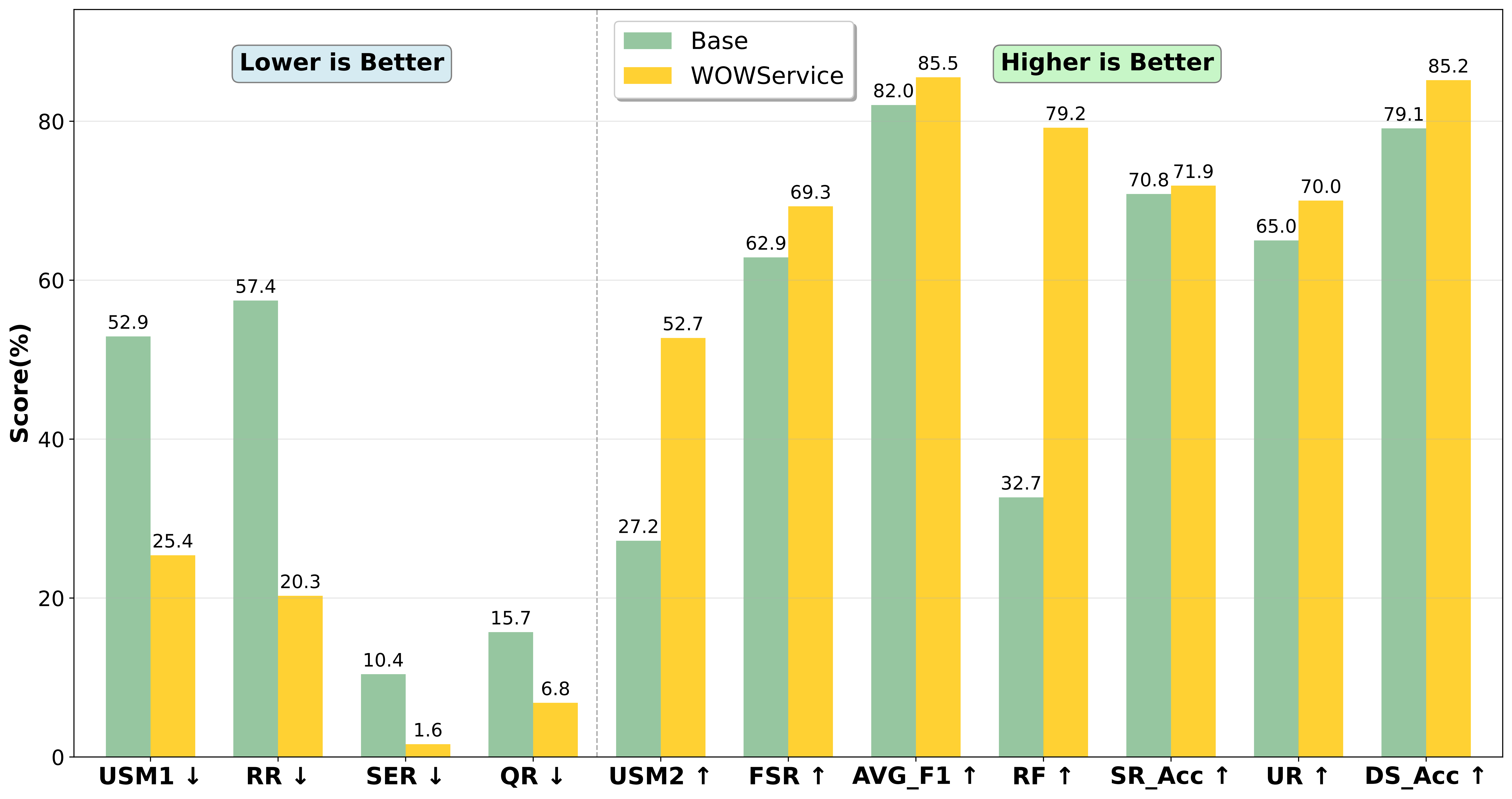 在实际业务场景的评估中,WOWService 框架在 11 项关键指标上全面超越了基础模型(Base Model),展现出卓越的业务能力和用户体验提升。具体来看,WOWService 在重复率(RR)、方案有效率(SER)、排队率(QR)、满分率(FSR)、平均 F1 分数(AVG_F1)、召回频率(RF)、方案准确率(SR_Acc)、可用性率(UR)以及领域准确率(DS_Acc)等指标上均取得了明显优势,在两个用户满意度指标 USM1、USM2 上也获得了大幅度改善。无论是自动化服务能力、业务闭环效率,还是多场景适配和智能推理水平,WOWService 都实现了全方位的突破,为本地生活服务的智能交互系统规模化落地和持续优化提供了坚实保障。