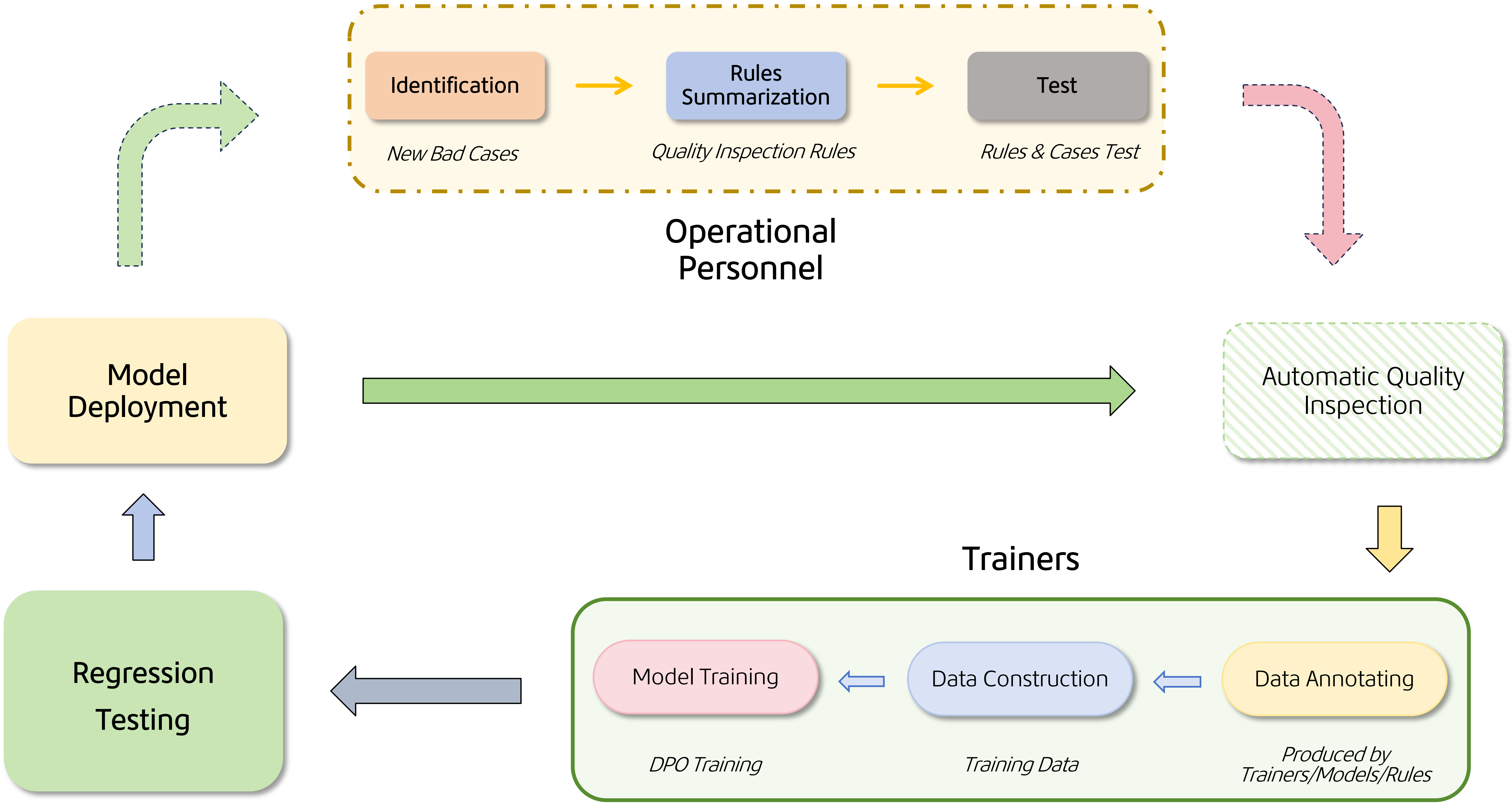 自我优化训练(SRT)机制通过自动筛选线上服务日志中的高质量服务案例,选取优秀表现作为正样本补充训练集,从而提升模型在真实业务场景下的服务能力。对于实际业务中表现不佳的负样本,SRT 能够自动进行归因分析,并对原始对话进行重写,生成偏好对比数据,用于训练模型识别并规避低质量输出,推动模型持续进化。依托线上服务日志体系,SRT 实现对对话数据的自动采集、筛选和评估,构建自我进化的数据闭环,通过不断迭代优化训练集,持续提升智能交互模型的服务能力和用户体验。