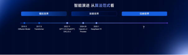 第一个维度是算法架构。算法和模型最典型的例子,是2017年谷歌发表的Transformer论文。当时大家并没有意识到这篇论文有多了不起,谷歌自己也没有意识到。后来OpenAI做了预训练,推出GPT1、GPT2、GPT3,从那一刻开始世界被改变。最近一年里,2024年9月推出的o1让大家意识到大模型推理能力的巨大提升,而DeepSeek改变了中国大模型的发展,也改变了世界大模型和开源大模型的发展方向。