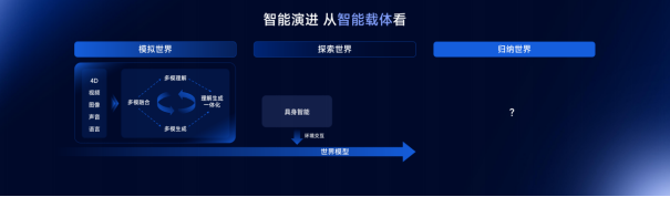 最近大家常听到“世界模型”。世界模型是在多模态基础上向前推进,把物理规律融进去,用模型来理解和探索真实世界。世界模型最终会进入机器人、自动驾驶汽车、飞行器等具身载体。今天也会谈具身智能。
