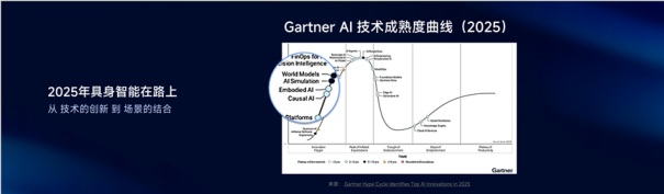 我常看Gartner的AI技术成熟度曲线。它把所有AI技术按阶段分类。刚起步的有量子之类,持续向上的是具身智能,它还在上升期,机会非常多。顶端是最激动人心的技术,2025年被称为AI Agent元年。再往后,一些技术会慢慢冷却,最后剩下真正有市场生命力的。