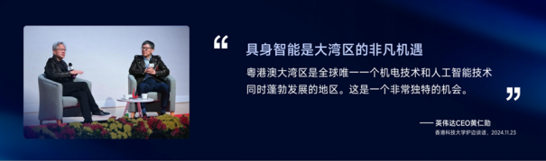 以机器人为例,具身智能不等于机器人,但机器人是最好例子。机器人像人:眼睛看、大脑算、手脚动。大湾区正是机电一体化和AI同时蓬勃的地方。黄仁勋去年在香港科技大学和我对谈时就说,粤港澳大湾区在机电和AI的结合上非常像德国和日本,拥有巨大机会。