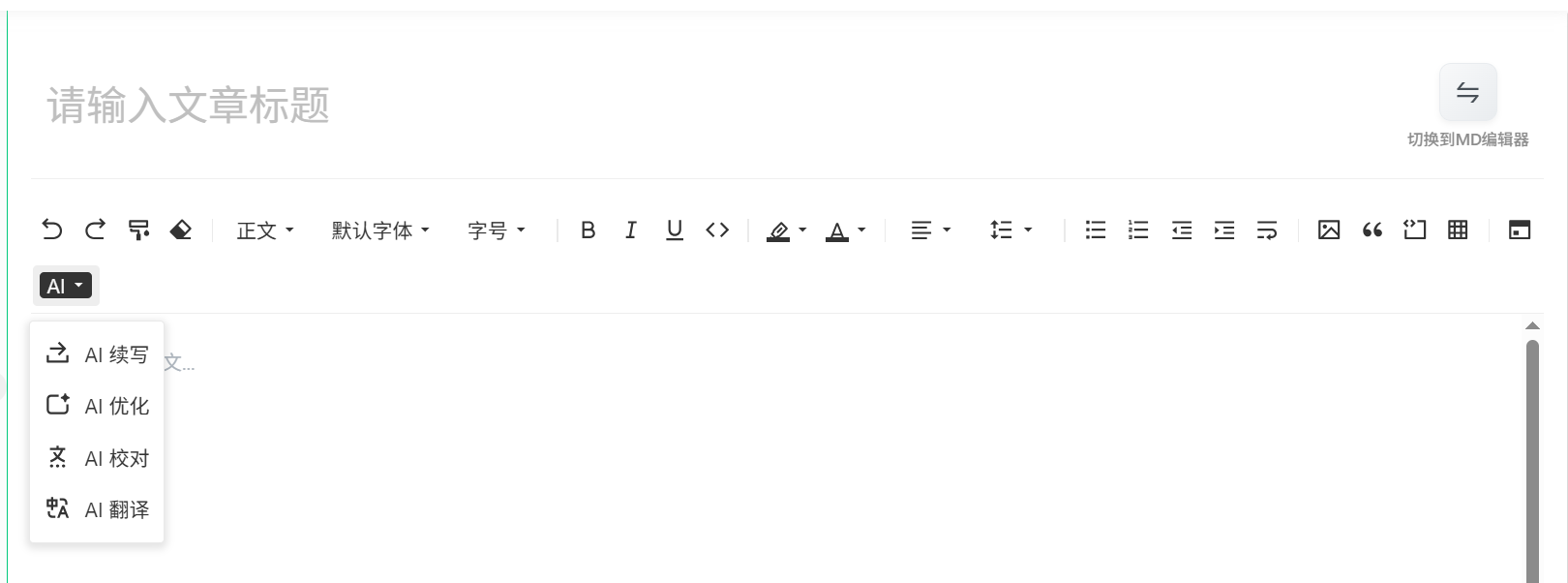 目前,智写平台已深度集成 DeepSeek、Qwen 以及 GLM 等主流大模型,用户可根据创作需求或偏好在多个模型间灵活切换。平台界面设计简洁直观,操作流程简单易用;同时支持 MD 编辑器与富文本编辑器的双模式切换,满足多样化编辑习惯。