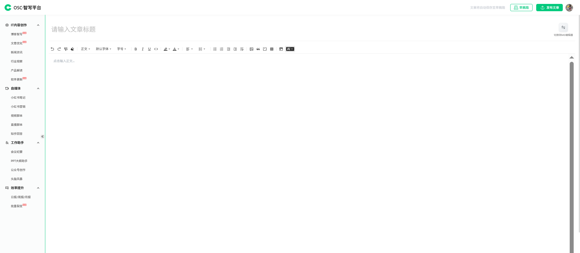 “OSC·智写平台”现已重磅上线,这是一个基于先进 AI 技术的在线写作助手,助力各位巧用 AI 工具,提升内容产出。接下来,就让我们详细了解一下智写平台都有哪些便利功能。