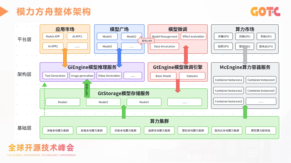 在此基础上,模力方舟(Gitee AI)被设计为一个面向开发者、企业与终端场景的 AI 应用共创平台。它整合模型服务、Serverless 化能力、API 组合与应用生命周期管理,并依托 Gitee 既有 DevOps 能力实现从开发到上线的协同支持。平台的整体能力划分为四大部分:AI 模型广场、模型定制、AI 开发者教育与 AI 应用共创。