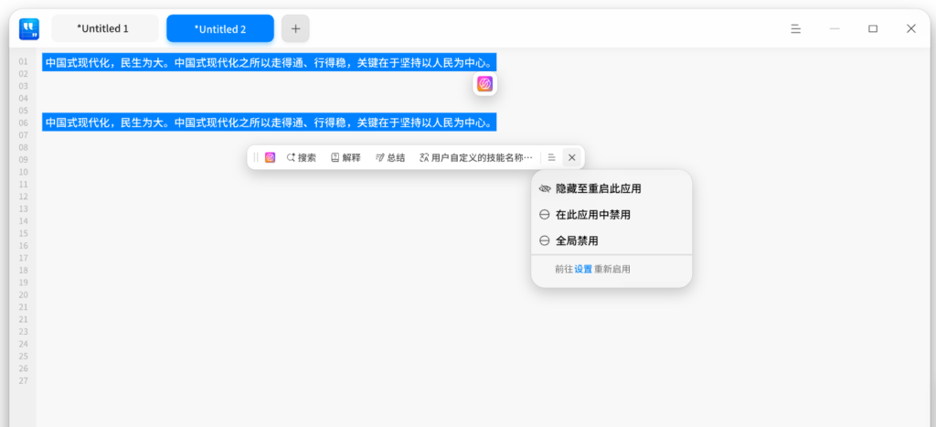 如需彻底关闭,可选择“在此应用中禁用”或“全局禁用”,后续可在UOS AI设置中重新开启。