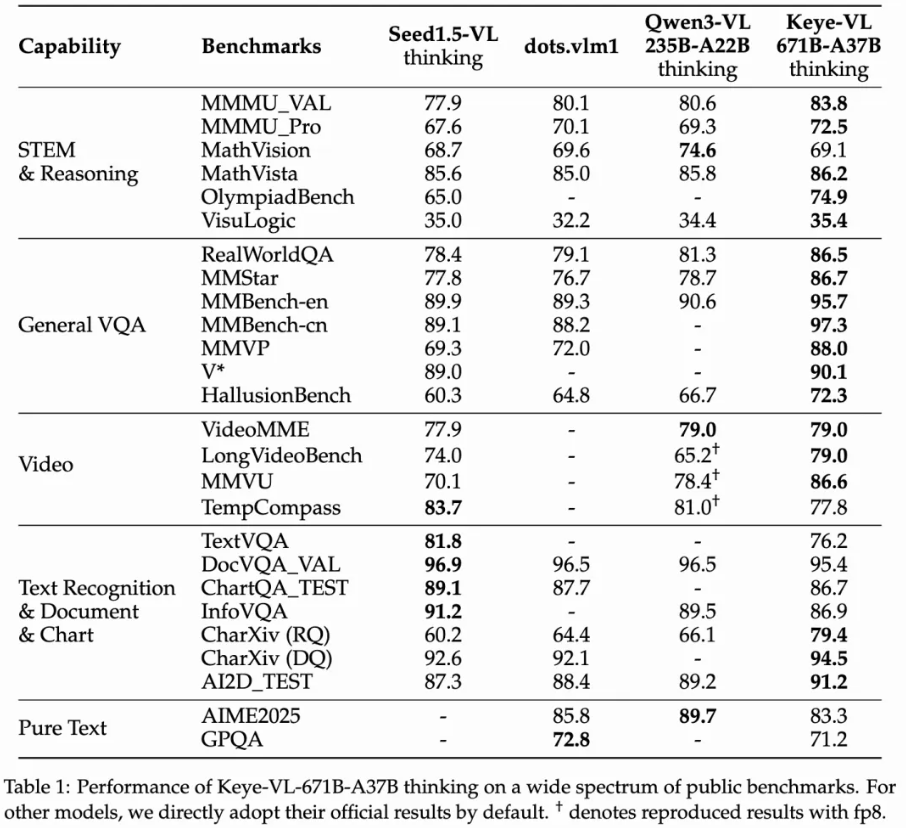 在保持基础模型强大通用能力的前提下,Keye-VL-671B-A37B 对视觉感知、跨模态对齐与复杂推理链路进行了系统升级,实现了多模态理解和复杂推理的全方位性能跃升:更会“看”、更会“想”、也更会“答”。无论是日常场景还是高难任务,都能给出更准确、更稳健的回应。