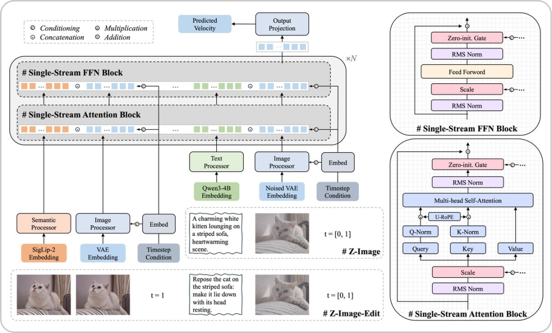Z-Image 仅以 6B 的参数量就能实现媲美百亿级模型的生成效果,关键在于其系统性的效率优化设计,覆盖数据、架构、训练与推理四大支柱。