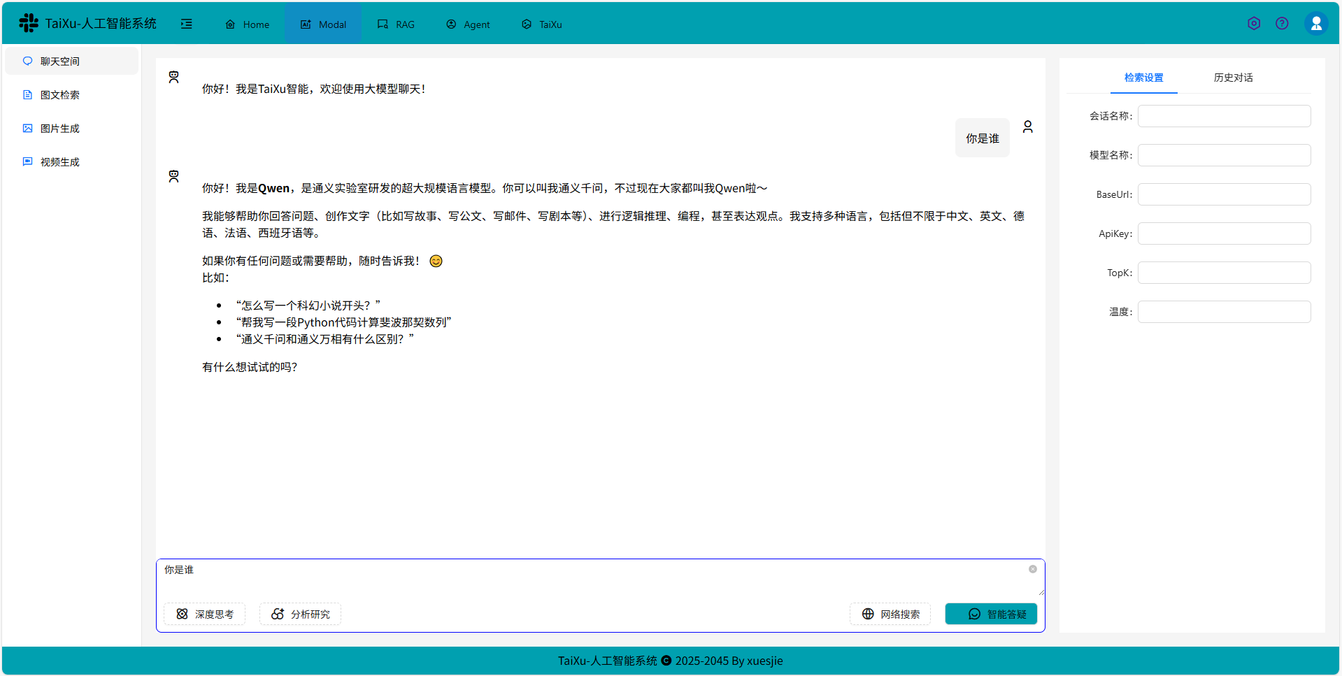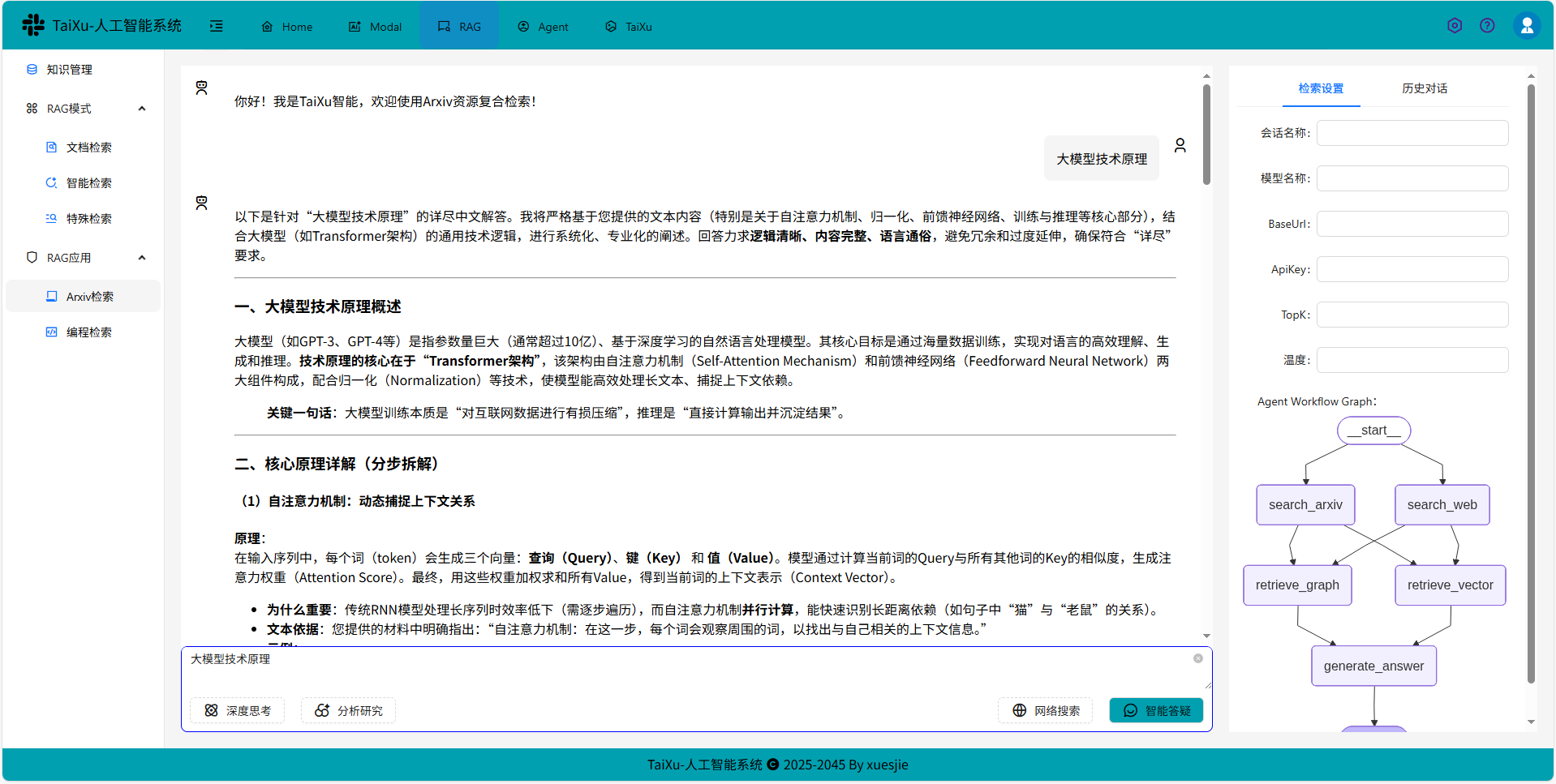 TaiXu-Admin 是 AI 技术集成的智能技术系统,后端用 Python 编写实现,前端用 React 开发交互页面,涉及到的大模型技术有 LLM 对话、RAG 和 Agent 等,大模型应用框架组件有 LangChain 和 LangGraph,支持 RAG 模式、Agent 模式、Prompt 工程、工具调用、记忆管理等功能,引入了对话式交互、知识检索增强生成(RAG)、多智能体协同(Agent)等 AI 能力。