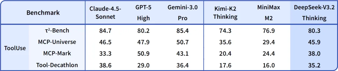 表2:DeepSeek-V3.2 与其他模型在各类智能体工具调用评测集上的得分