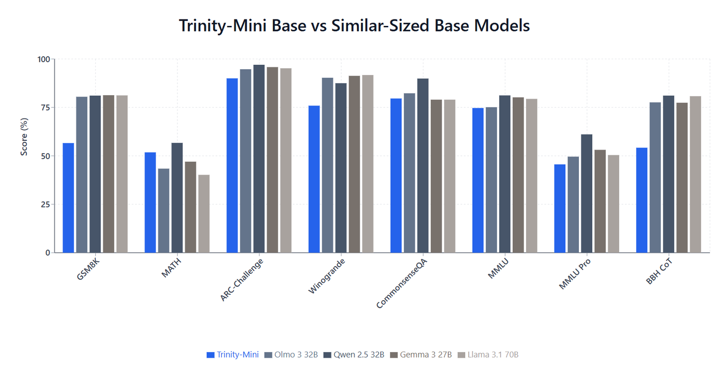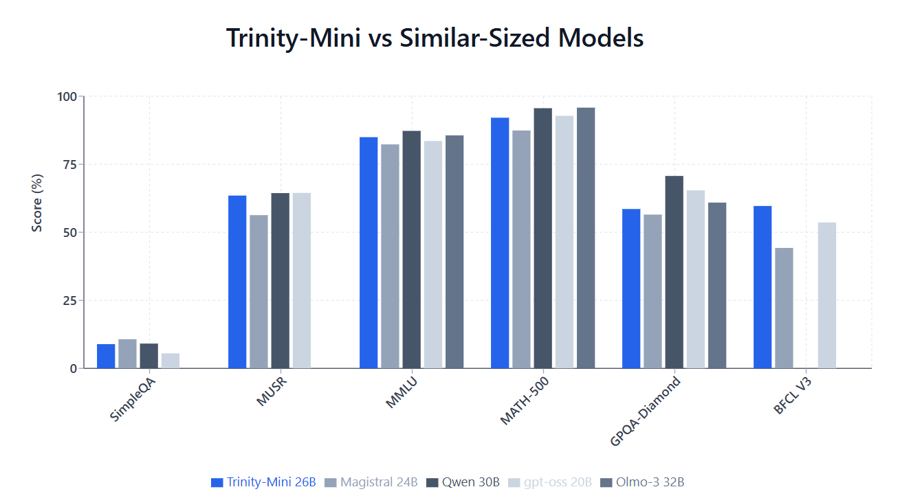 Trinity Mini:26B 参数 MoE(3B active),面向云或本地机房,适用于多步推理、工具调用、长文本处理等任务。