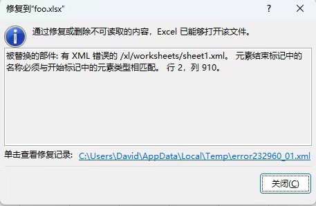 Excel 的容错机制其实非常强大。当它提示“是否尝试恢复”并点击确认后,如果文件能够打开,它通常会弹出一个包含“修复记录”的对话框。 切记,不要直接关闭这个窗口。 点击其中的 XML 日志链接,它通常会给出一个极其关键的线索,例如:“/xl/worksheets/sheet1.xml 中的 xxx存在问题”。这短短一行字,直接将问题的搜索范围从整个文件缩小到了 sheet1.xml 的相关位置。