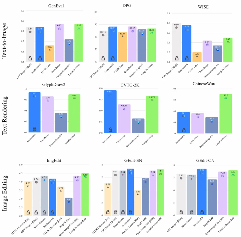在文生图方面采用大规模的人工主观评分(MOS)方法,核心覆盖 文本-图像对齐、视觉合理度、视觉真实度、美学质量4个维度,LongCat-Image 的真实度相比主流开闭源模型表现出色,同时在文本-图像对齐与合理度上达到开源SOTA水平。